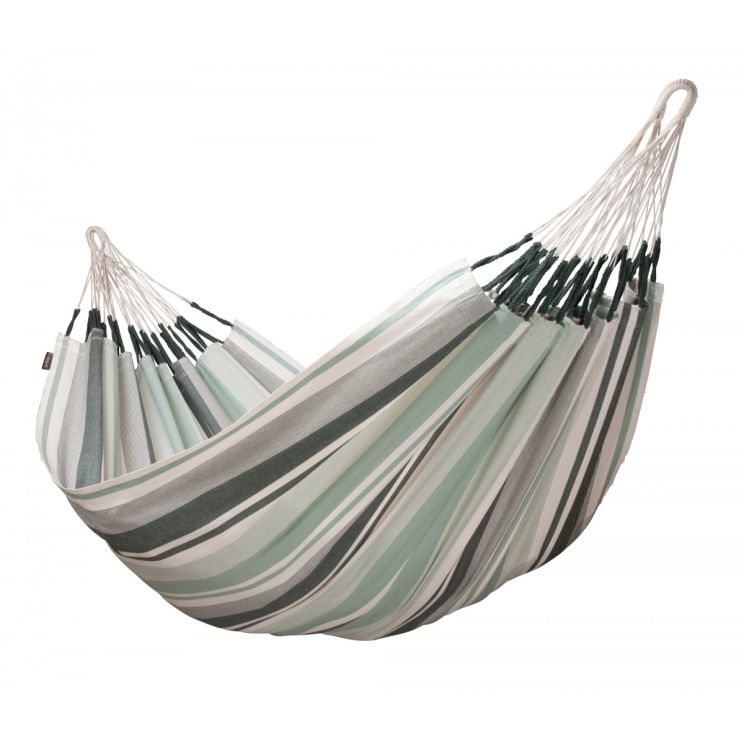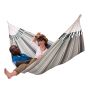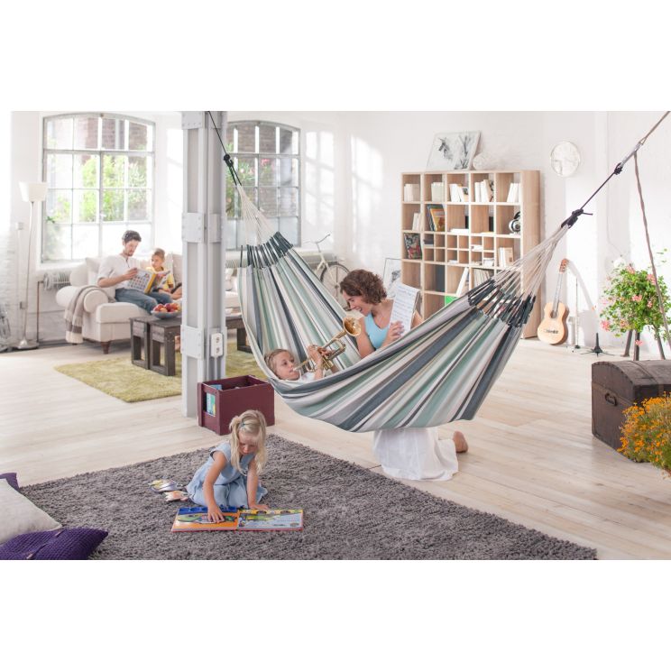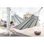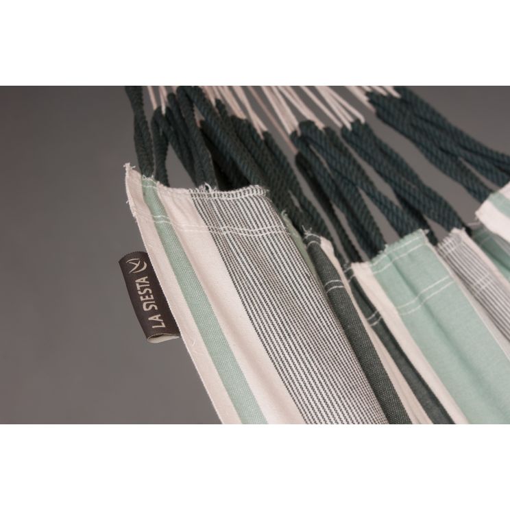 De dubbel-hangmat Paloma Olive overtuigt door klassiek elegant design in koele blauw-grijstinten. Deze hangmat wordt gemaakt in Colombia uit hoogwaardige pure katoen. Doordat beide randen van het lig gedeelte bijzonder dicht zijn zorgt dit voor extra stabiliteit. De hangmat heeft een maximale draagkracht van 160 kilo.