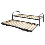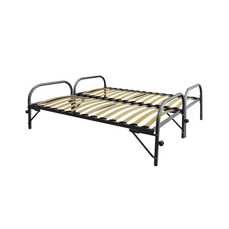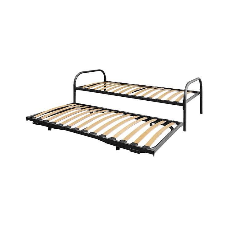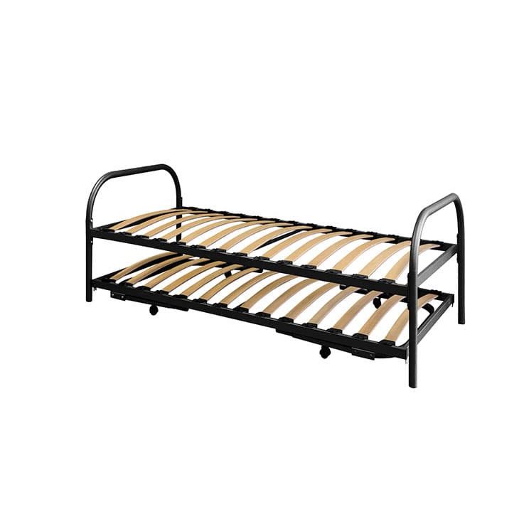 Een ruimtebesparend dubbel divan onderschuifbed, ideaal voor kleine ruimtes of voor gebruik als logeerbed. Dit dubbel divan onderschuifbed bestaat uit een onder- en bovenbed en heeft een lattenbodem met verende latten en kunstofkappen.
