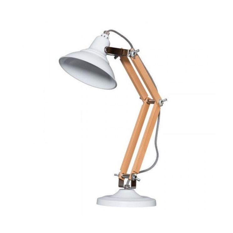 Scandinavisch design dus echt helemaal van dit moment. De lamp heeft en metalen kap en voet en de armen zijn van hout. De lamp heeft een prachtig strijkijzersnoer dit geeft de lamp nog meer uitstraling.