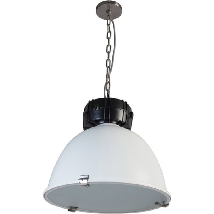 De High bay hanglamp is gemaakt door het merk ETH. Deze lamp heeft een industriële uitstraling door het gebruik van aluminium en het metaal. De lampenkap heeft aan de onderzijde een glazen plaat die bevestigd is met klemmen. De hoogte van de lamp kunt u zelf eenvoudig regelen tot maximaal 110 cm.