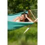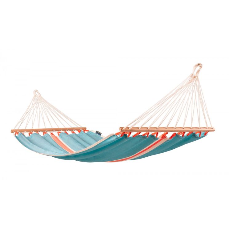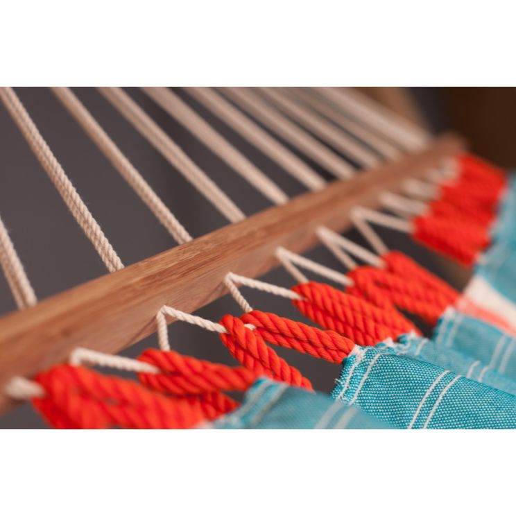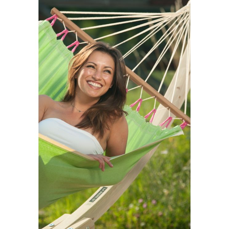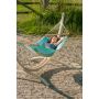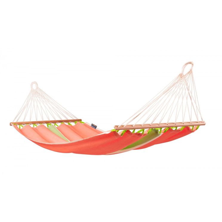 Deze fleurige hangmat Fruta komt uit Colombia en wordt gemaakt van weerbestendig, sneldrogend HamacTex®. Deze kunstvezel is UV-bestendig en waterafstotend zodat de hangmat ook bij alle weersomstandigheden goed beschermd is en de mooie fruitige kleur behouden wordt. Een flinke bui kan een product van HamacTex® goed hebben. De hangmat is sneldrogend en dus ideaal. Versterkte weefranden maken deze hangmat bijzonder scheurbestendig. De spreidstokken zijn gemaakt van hoogwaardig bamboe uit verantwoorde bosbouw (FSC®). De maximale draagkracht van de hangmat is 120 kilo.