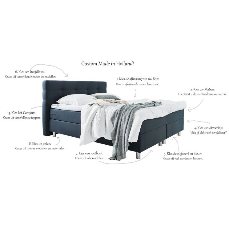 Deze oerdegelijke en zeer solide "Custom Made' boxspring wordt hier in Nederland voor u op maat gemaakt. U stelt de complete boxspring in enkele eenvoudige stappen én volledig naar eigen smaak samen.