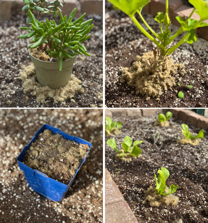 Wol mulch en wolkorrels worden gebruikt om planten sterker te maken en te beschermen, naast het verbeteren van de kwaliteit van de bodem, en dit voor maarliefst 6 tot 8 maanden lang. 10 gram wolvlokken is al genoeg zijn voor een doorsnee pot van 25 cm. Er zijn 3 manieren om wol mulch te gebruiken, zoals ook in de afbeeldingen terug te vinden is: