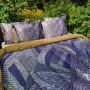 Dekbedovertrek Kymani heeft een drukker patroon met witte en gouden strepen op een paars/blauwe achtergrond. Door de donkere achtergrondkleur vallen de strepen extra goed op. De uni kleur aan de achterkant van het overtrek is goud.
