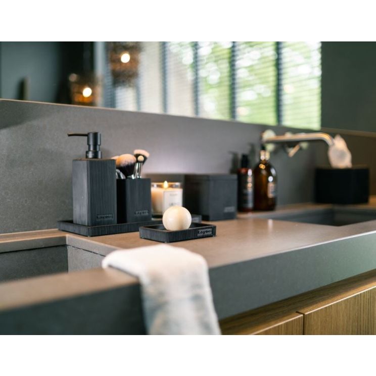 Gemaakt van suikerriet Luxe reliëf Uitsparing voor tissues Geschikt voor vierkante tissuedozen 13.5 x 13.5 x 14 (LxBxH) Onderdeel van de Dogo serie De Dogo badkamer accessoires is een complete badkamer lijn met luxe uitstraling. Alle producten in deze lijn zijn gemaakt van suikerriet: een duurzaam alternatief voor plastic. De Dogo serie kenmerkt zich door een sterk eenvoudig ontwerp met geribbeld reliëf. De producten zijn verkrijgbaar in groen, zwart en blauw. Tissuebox De tissuedoos zet je zo over een kartonnen tissuedoos heen, aan de bovenkant is een uitsparing om de tissues uit de doos te halen. De tissuebox is geschikt voor vierkante tissuedozen.