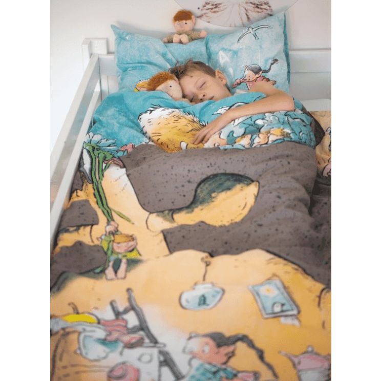 De kleine Gorgels komen uit de bekende boeken van Jochem Myjer. Dit zijn wezentjes die speciaal getraind zijn om kinderen te beschermen tegen Brutelaars. Op het Gorgelholletjes dekbedovertrek zie je wat de Gorgels allemaal uitspoken in hun eigen plekje. Het kleurrijke overtrek ziet er vrolijk uit in de kinderkamer. Op de bijpassende kussensloop zijn twee Gorgels te zien met de bekende uitspraak ‘Joebelabambam!’ Voorlezen voor het slapen gaan wordt nu nog leuker met het Gorgels dekbedovertrek.Het Gorgelholletjes overtrek is vervaardigd uit 100% katoen, een zachte en soepele stof. Katoen is een erg fijne stof voor beddengoed, omdat het luchtig en koel aanvoelt. Aan de onderzijde heeft het Gorgels overtrek een dubbel doorlopende instopstrook. Hierdoor past het dekbed er gemakkelijk in.