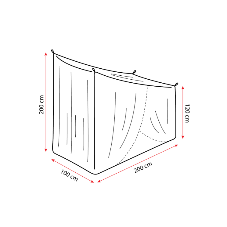 Afmeting: 100 cm breed, 200 cm lang en 120 tot 200 cm hoog