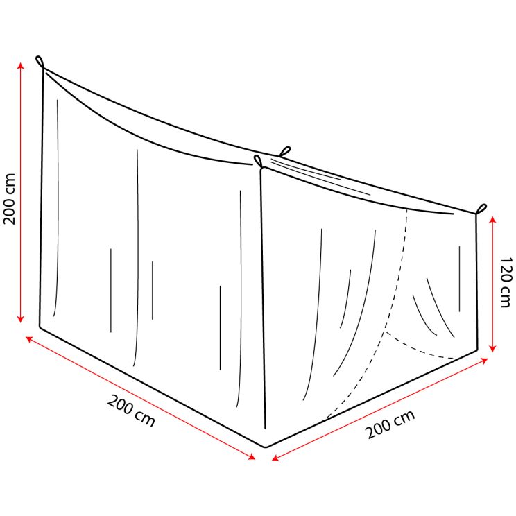 Afmeting: 200 cm breed, 200 cm lang en 120 tot 200 cm hoog