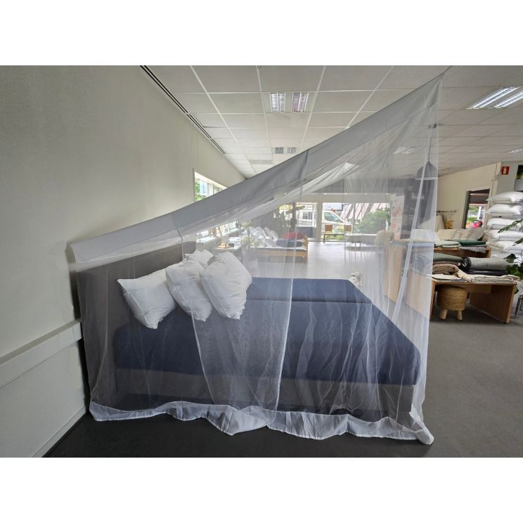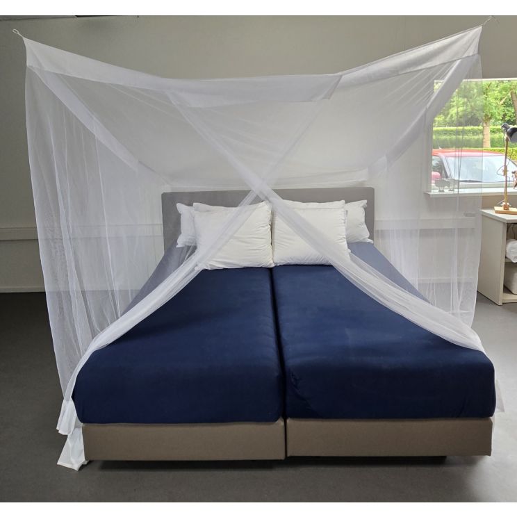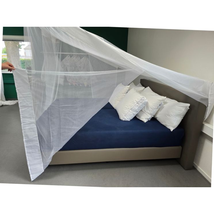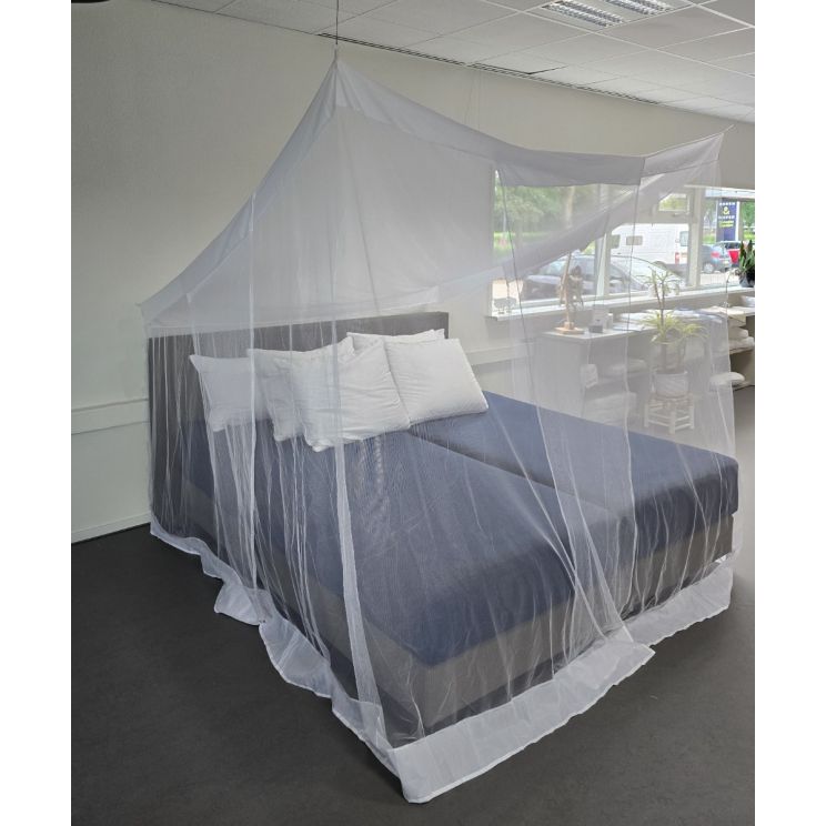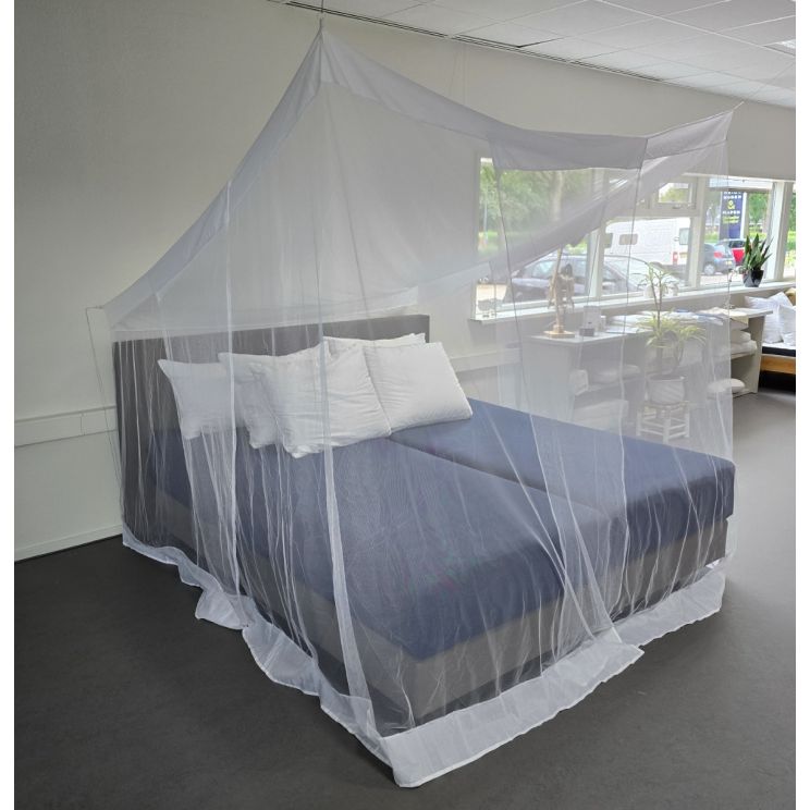 Klamboe Schuin Dak - Deze rechthoekige klamboe is speciaal ontwikkeld voor onder een schuin lopend dak en beschermt u tegen vervelende steek muggen en insecten. Met onze schuin dak klamboe kunt u ongestoord genieten van een goede nachtrust. De klamboe Schuin Dak 2-persoons is geschikt voor een 1 en 2 persoons bedden. Bij gebruik met een 1- persoons bed heeft u extra veel loopruimte rondom het bed wat het in- en uit bed stappen erg aangenaam maakt.