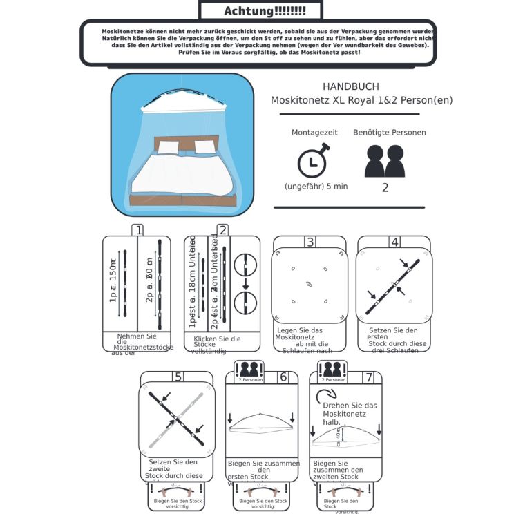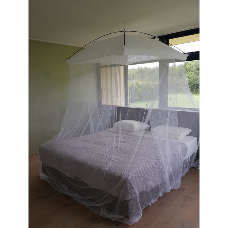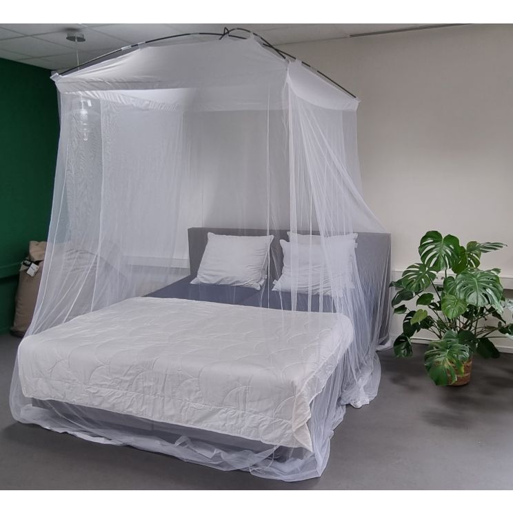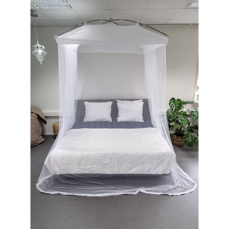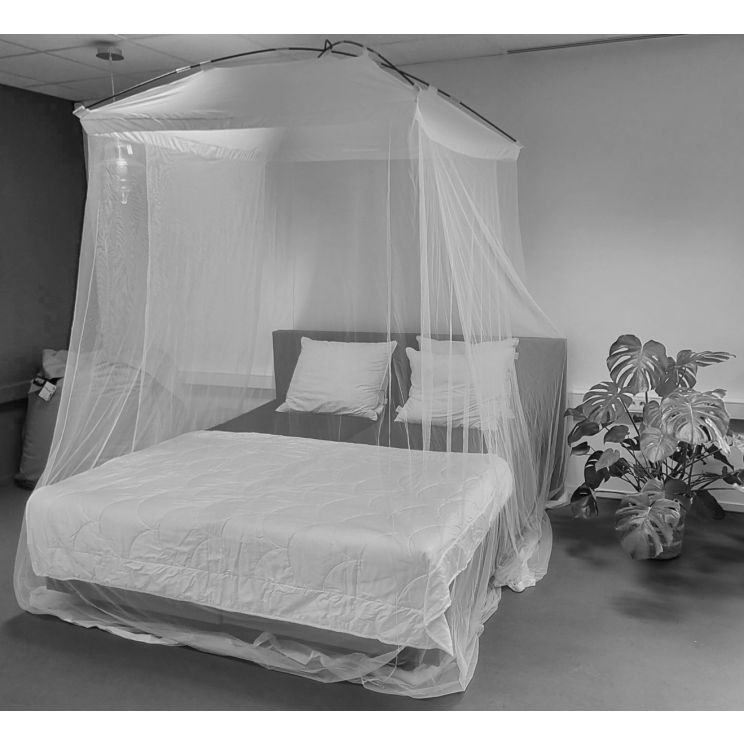 Mooie klamboe, die gemakkelijk in elkaar te zetten is en op de juiste hoogte te hangen is. We hebben een bed van 220cm x 200cm, fors dus, en deze klamboe gaat er met gemak omheen. Aan beide zijkanten zitten flappen om er gemakkelijk uit te komen. We zijn niet meer gestoken 's nachts sinds we deze klamboe hebben.