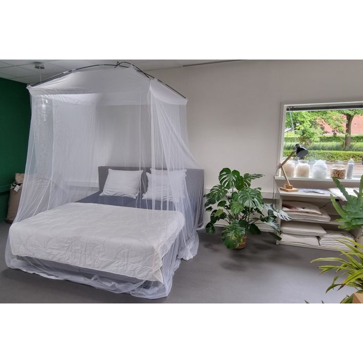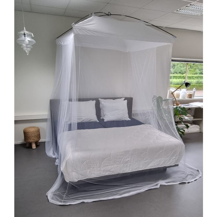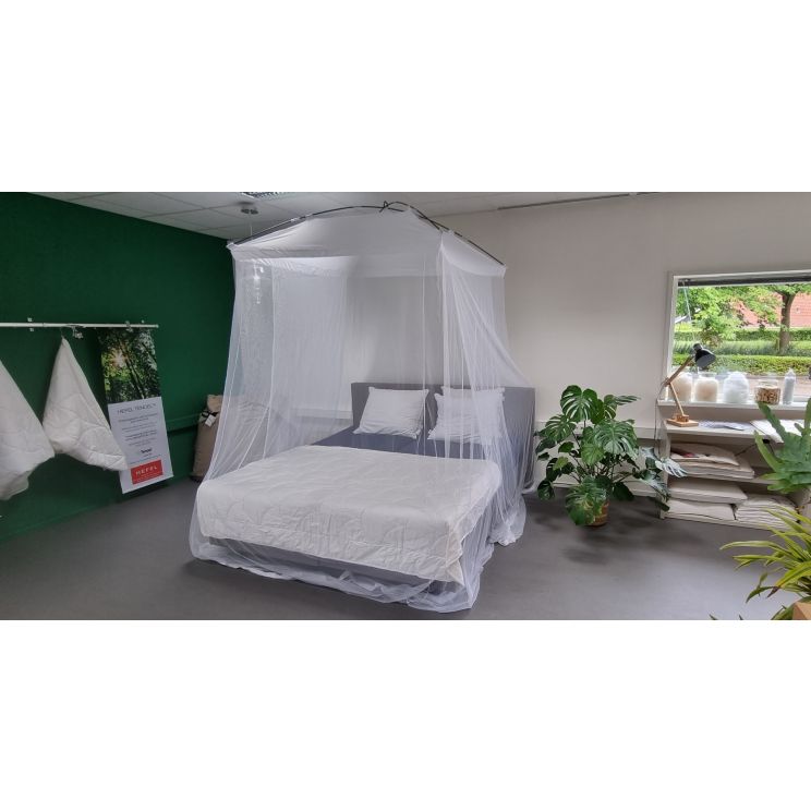 Heel blij ermee. Past goed om ons grote bed en geeft zo veel meer slaapcomfort dan de gewone 2-pers klamboe waar je nog met je hoofd tegen het plastic net aangeplakt ligt.