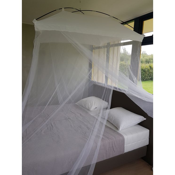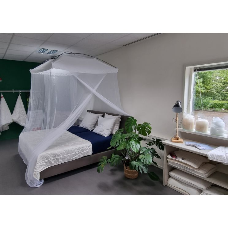 Een ander belangrijke pluspunt van deze constructie is dat het doek van de klamboe niet naar binnen valt. Er is geen contact tussen uw lichaam en het doek. De steekmuggen kunnen u dus niet bereiken. Bij een ronde klamboe is dat wel het geval. Het doek hangt dan naar binnen vaak op of tegen uw arm en u wordt alsnog gestoken. Kies daarom voor deze klamboe met zeer ruime vierkante top-kruis verbinding.