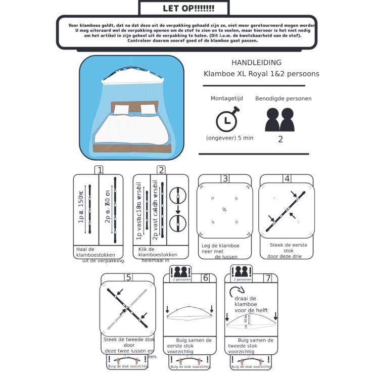 Deze schitterende Klamboe XL Royal 2 persoons is voorzien van 2 deuren en heeft een vierkante top-kruisverbinding. Dankzij deze slimme kruisverbinding heeft de Klamboe XL Royal maar 1 ophangpunt nodig. Dankzij deze vierkante top valt de klamboe mooi ruim langs alle 4 zijden van uw bed. Hierdoor maakt u met deze Klamboe XL Royal van uw bed in een handomdraai een sfeervolle en romantische hemelbed.