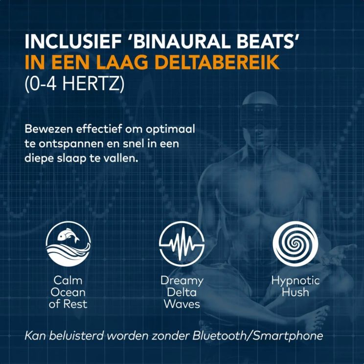 UNIEK: ingebouwde ‘binaural beats’ in een laag deltabereik (0-4 hertz) die helpen om optimaal te ontspannen en snel in een diepe slaap te vallen.