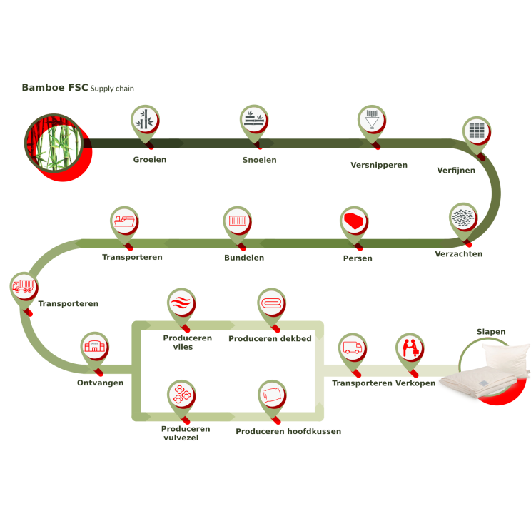 De bamboe vulling van het kinderdekbed heeft het FSC-keurmerk en garandeert een verantwoorde herkomst uit duurzaam beheerde bossen en/of recyclage. Hout en afgeleide producten of andere bosproducten die een FSC-claim dragen, kunnen dit bovendien enkel wanneer ook de verwerkende keten van bos tot eindproduct gecontroleerd wordt op vlak van traceerbaarheid.