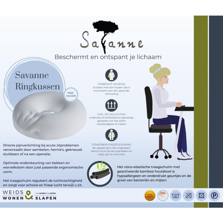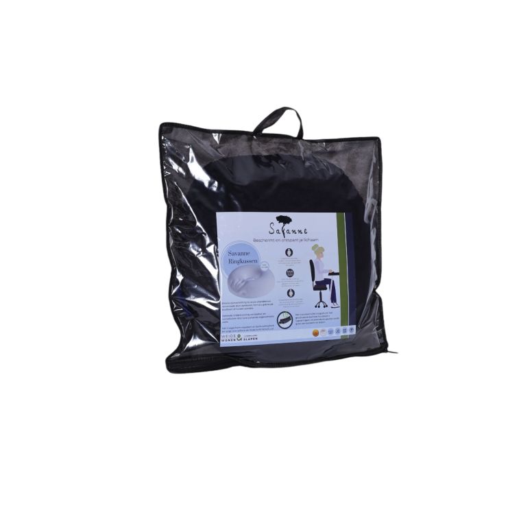 Het zit ringkussen (donut) van Savanne is speciaal ontwikkeld om de druk op het zitvlak te verlichten. Dit kussen is uitermate geschikt voor gebruik bij zitklachten na bijvoorbeeld een operatie, een bevalling, bij decubitus of aambeien.