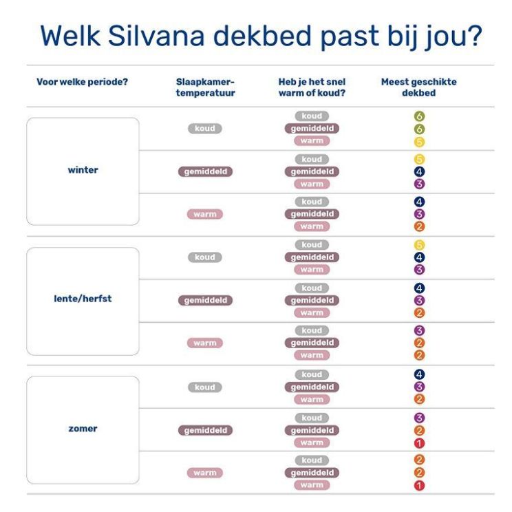 De Silvana Royale dekbedden zijn verkrijgbaar in zes verschillende kleuren met elk hun eigen dikte en dus warmte (het Colortemp® systeem).