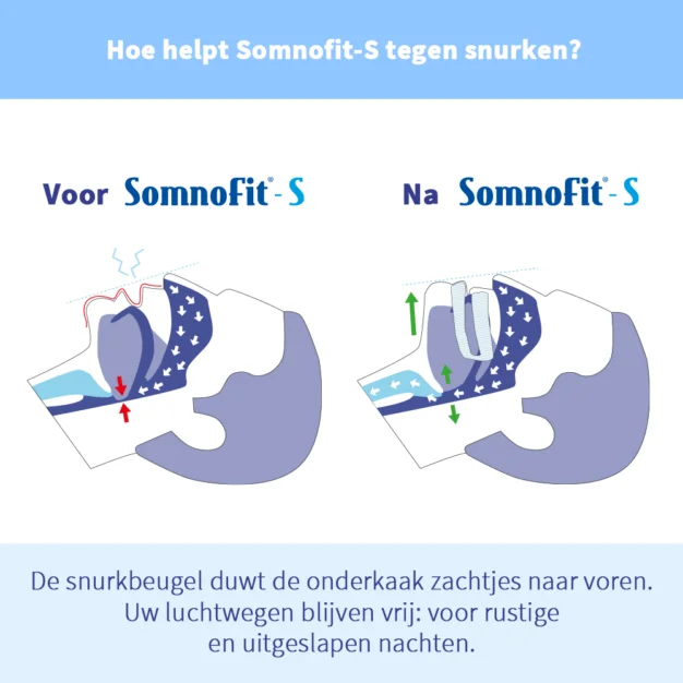 Deze slaapbeugel - SomnoFit-S - Snurkbeugel wordt ‘s nachts in de mond ingebracht. De slaapbeugel opent uw luchtwegen door uw onderkaak zachtjes naar voren te duwen, waardoor vernauwde of verstopte luchtwegen, een van de belangrijkste oorzaken van snurken en positieapneu, worden voorkomen.