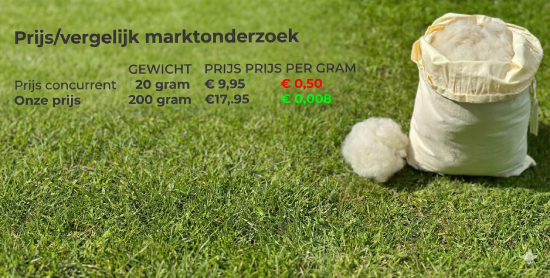 Wij kiezen er dan ook voor om onze WonderWol aan te bieden in duurzame gerecyclde zakje met een vulgewicht van 200 gram. Daarmee heeft u voldoende wol in huis voor vele fijne wandelingen en /of voor ander soortige behandelingen. Bestelt u 4 zakjes WonderWol dan heeft u voldoende WonderWol voor een heel wandelseizoen én nemen wij de verzendkosten voor onze rekening - gratis verzending.